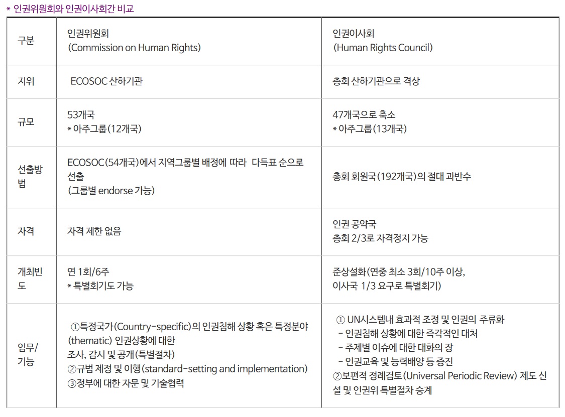 - UN 경사리 산하의 '인권위원회' → '인권이사회'로 대체됨. 총회 산하 보조기구(subsidiary organ)로 격상.